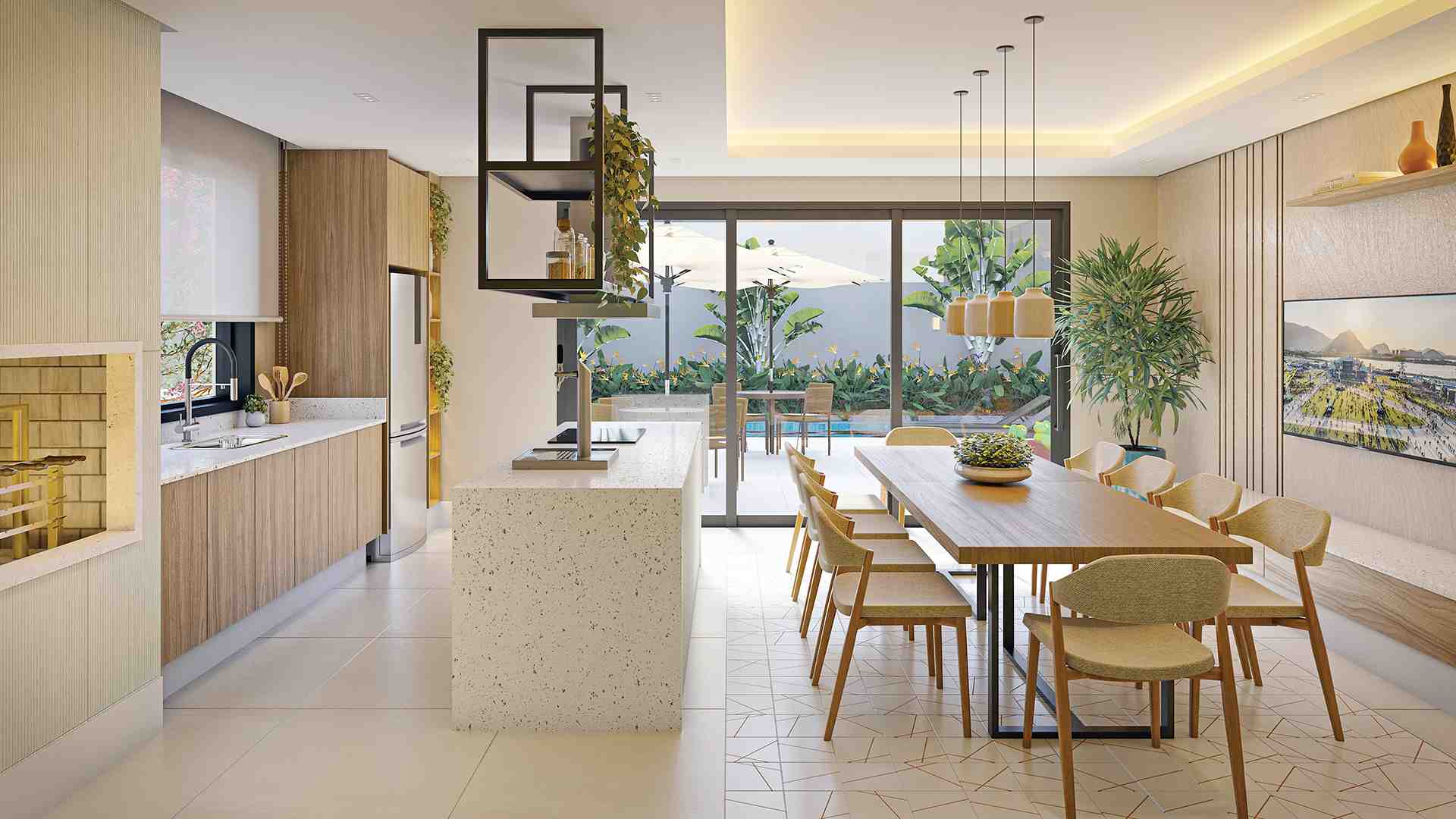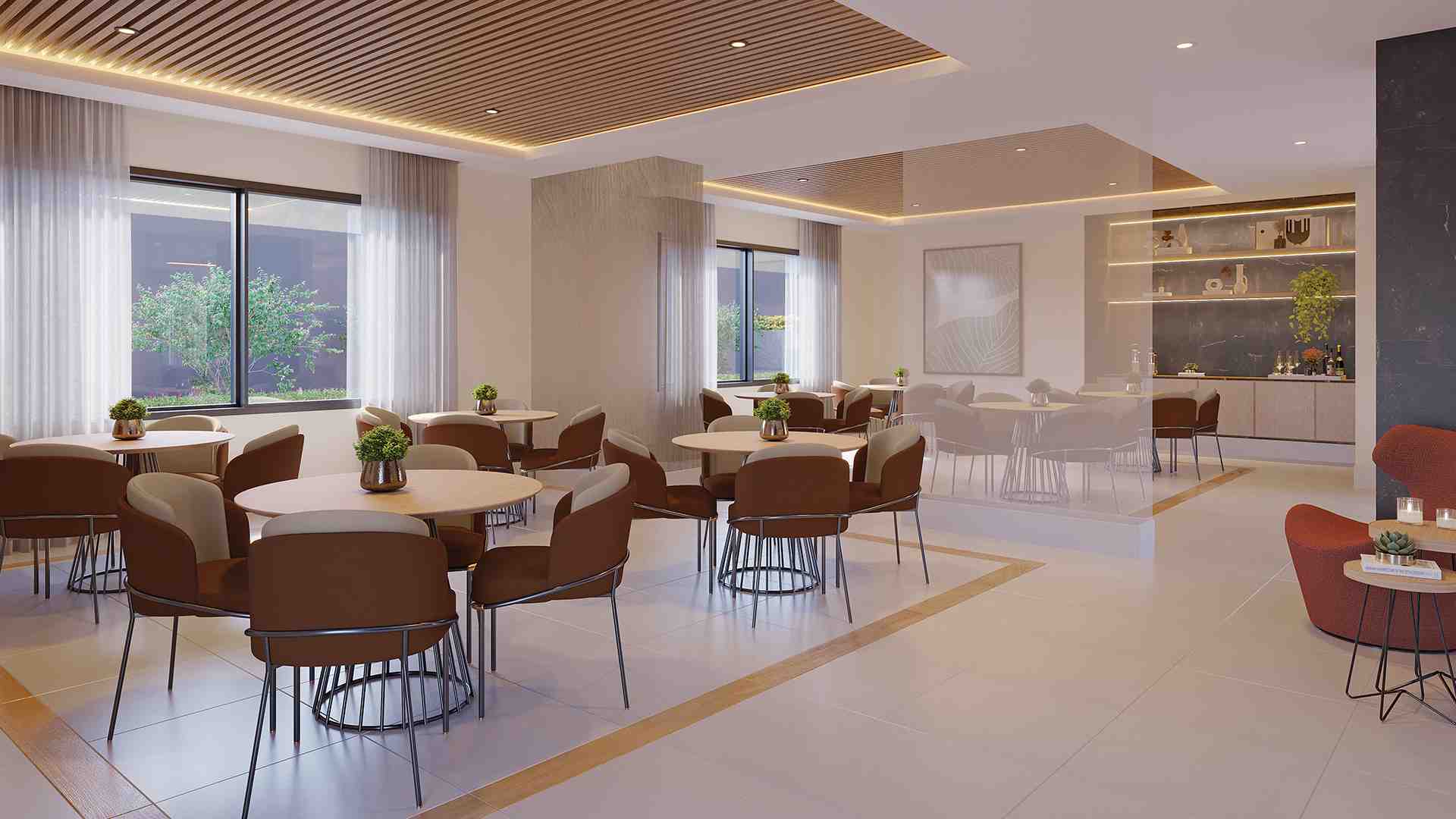 A varanda gourmet do ÁUREA será muito espaçosa, com churrasqueira a carvão completa, incluindo iluminação e sistema de exaustão e será integrada à cozinha e à sala de jantar. O piso nivelado traz modernidade e garante a perfeita circulação entre os ambientes.