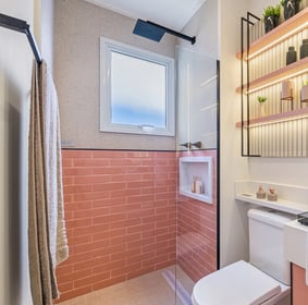 Nas suítes do ÁUREA, as janelas dos banheiros serão maiores do que o padrão e estarão instaladas na área do box, garantindo mais iluminação e ventilação naturais. A circulação de ar será garantida com diversos outros pontos luz e ventilação naturais no apartamento.