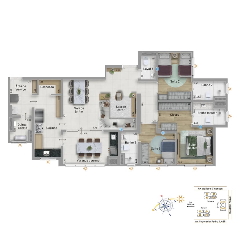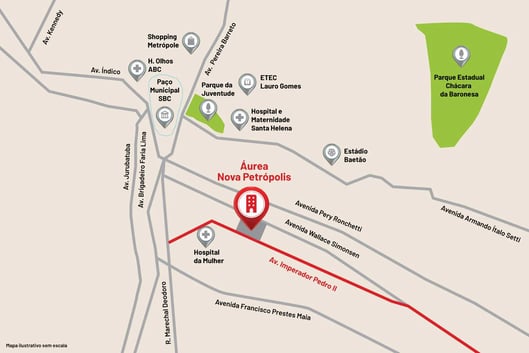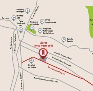 Nova Petrópolis é um dos dois melhores bairros de São Bernardo do Campo, bem estruturado e com ruas arborizadas, como a Imperador Pedro II, endereço do ÁUREA NOVA PETRÓPOLIS. Trata-se de um lugar tranquilo para morar, com vizinhança definida e que tem tudo perto. Então, dá para fazer tudo a pé. Na rua de trás do condomínio, haverá um supermercado, e, na frente, está a Associação Comercial de São Bernardo, ou seja, dois prédios baixos, preservando a vista dos apartamentos. Também é tranquilo e seguro sair com o pet para caminhar, pois o Batalhão da Polícia Militar fica a apenas uma quadra de distância.
